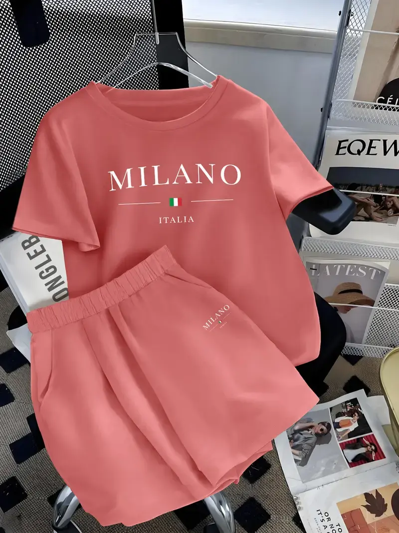 2pcs Summer Casual Women's Round Neck Short Sleeve Set with Milano City Print