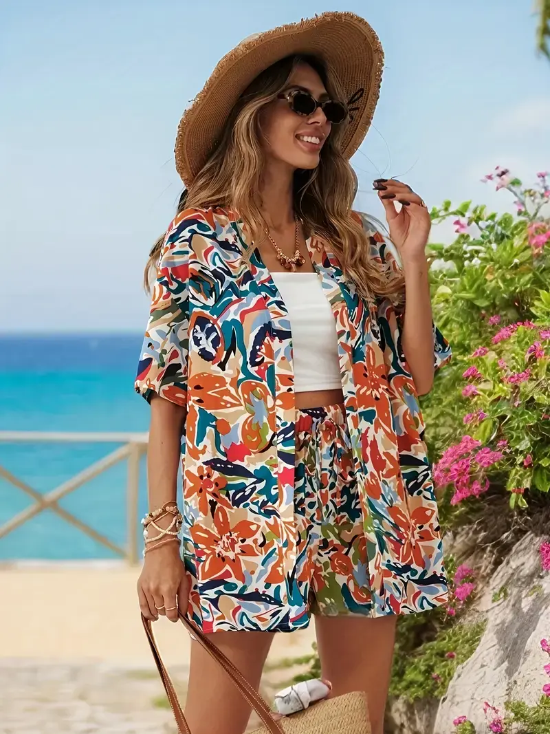 2pcs Women's Vacation Print Loose Shirt and High-Waist