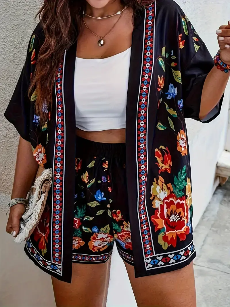Bohemian Floral Print Kimono Cardigan and Shorts Set