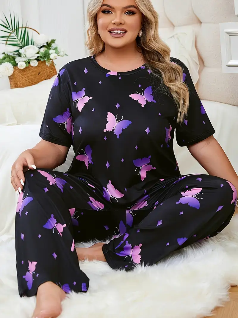 Cute Pajama Set, Plus Size Star & Butterfly Print Short Sleeve Crew Neck T-shirt & Pants Pajama 2 Piece Set