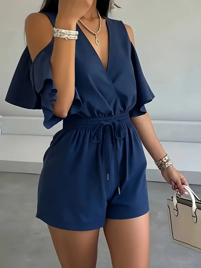 Elegant Off-Shoulder V-Neck Jumpsuit with Ruffle Detail and Waist Tie