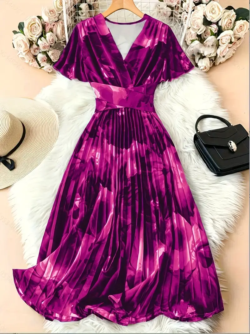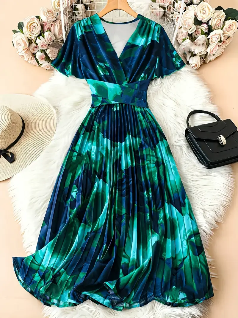 Elegant V-Neck Short Sleeve Floral Print Pleated Dress