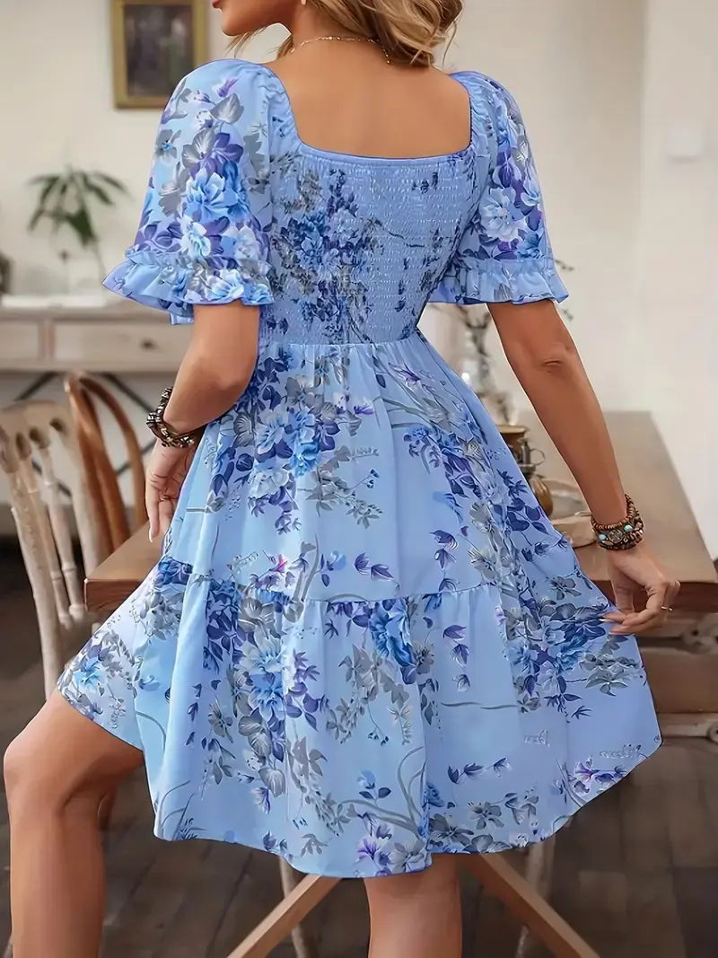 Floral Print Square Neck Dress with Puff Sleeves