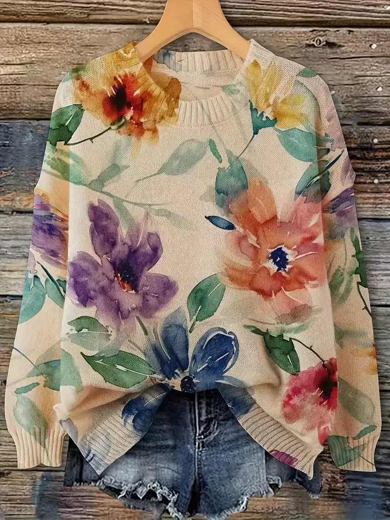 Floral Print Sweater - Elegant Crew Neck