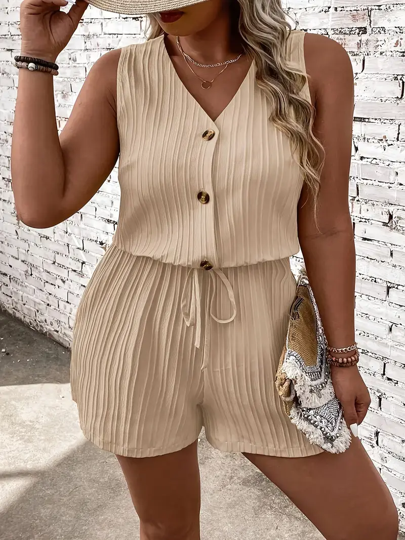 Solid Color Short Sleeve V-Neck Jumpsuit with a Half Placket