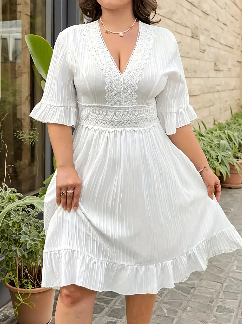 V-Neck Lace Detail Ruffle Skirt Dress