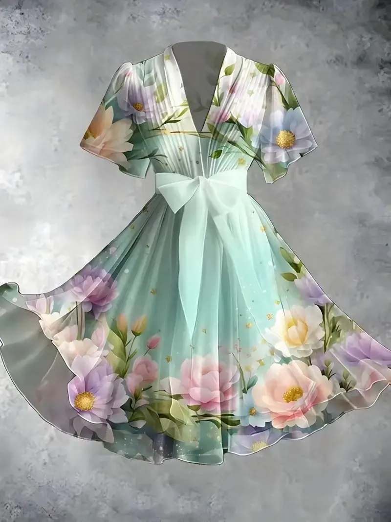 Vintage Floral Art Print V-Neck Elegant Chic