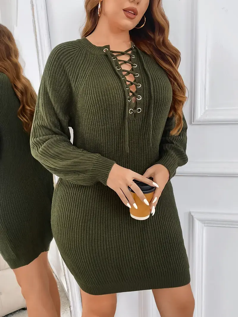 Women's Casual V-Neck Long Sleeve Sweater Dress with Front Button Detail & Tie Waist