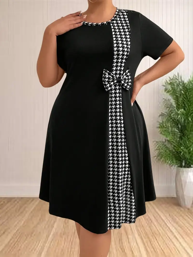 Women'S Elegant A-Line Dress with Houndstooth Bow Detail