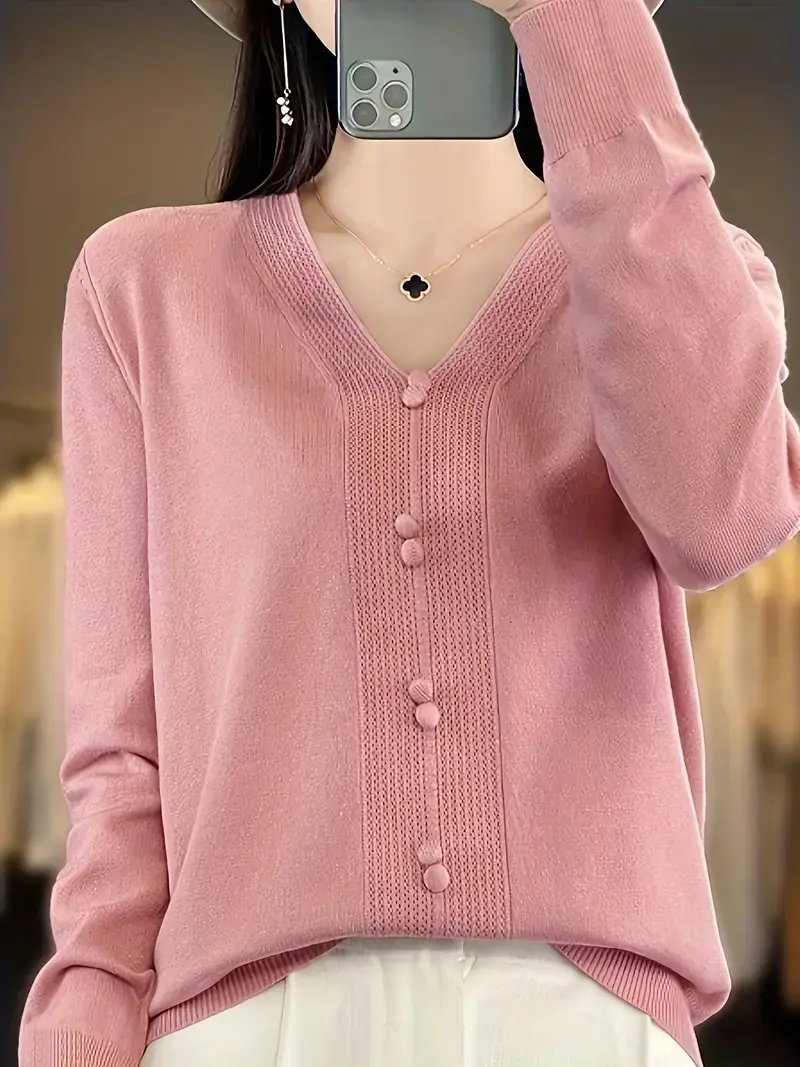 Women's Elegant V-Neck Sweater with Faux Buttons