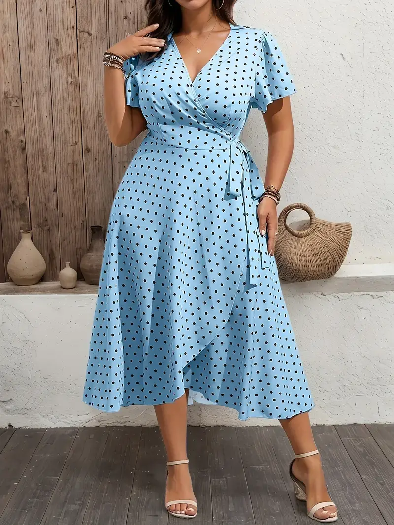 Women'S Light Blue Polka Dot V-Neck Dress