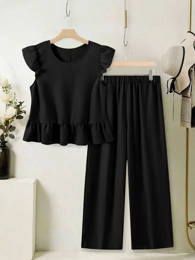 Women's Holiday Casual Solid Color Ruffle Hem Top And Wide-Leg Pants Two-Piece Set